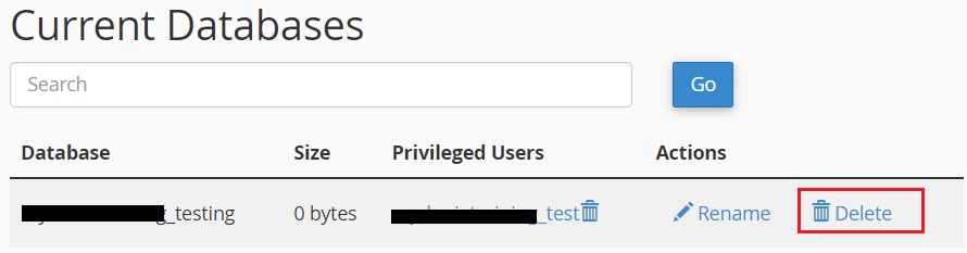 Under the "Current Databases" heading, select the database you want to delete and click on the "Delete Database".