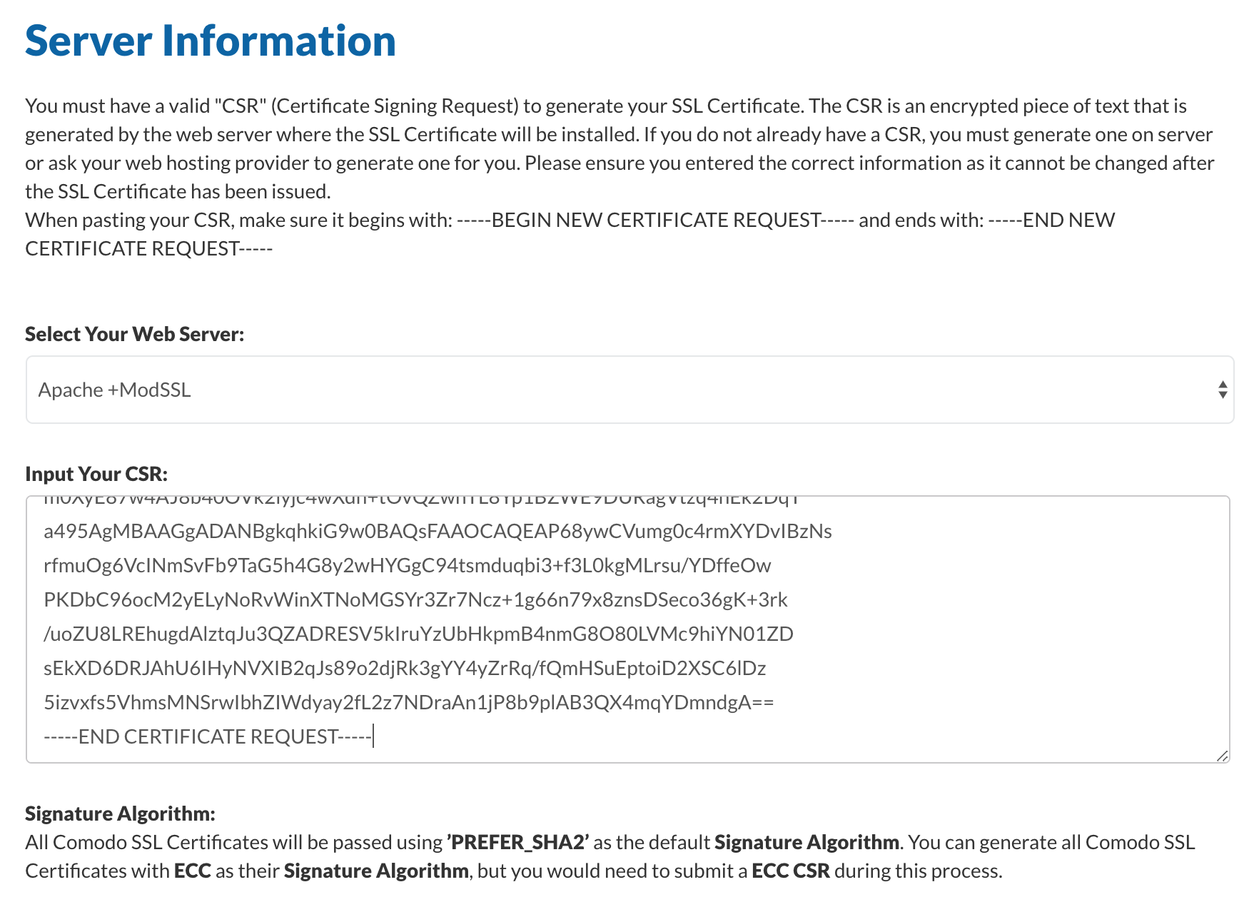 Remember to choose the correct type of web server that you will use to host the SSL certificate. The most common web server is Apache for linux and IIS for Windows. You will need to copy the content of your CSR file and paste it is the second put box. Remember to copy all the content.