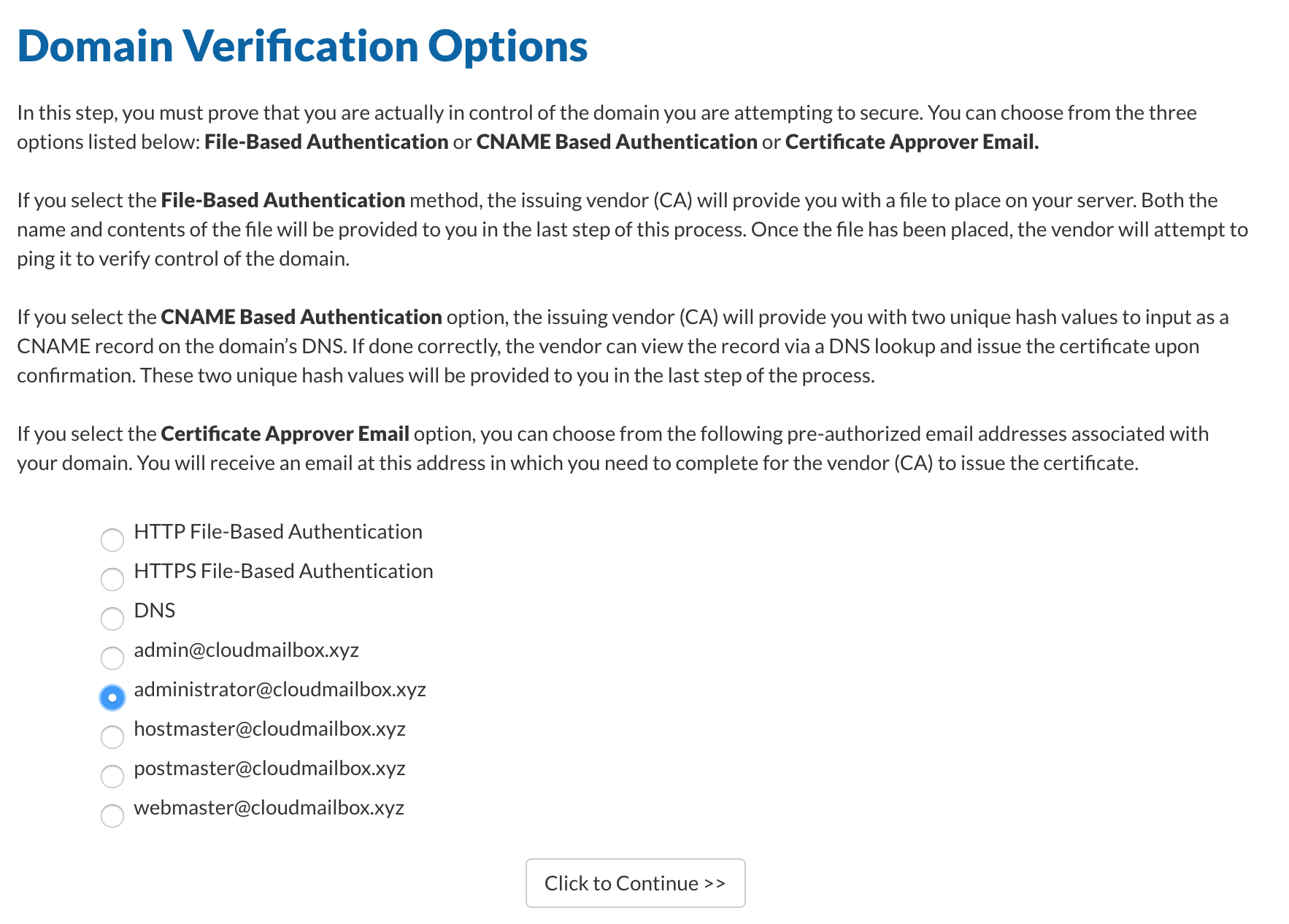 5. Now you will need to choose how you would like to proceed with your domain validation. The most common validation process is being done through email. However, there are also few other steps that you can choose. However, these flexibility are totally depends on the Certificate Authority which provide your SSL certificates.