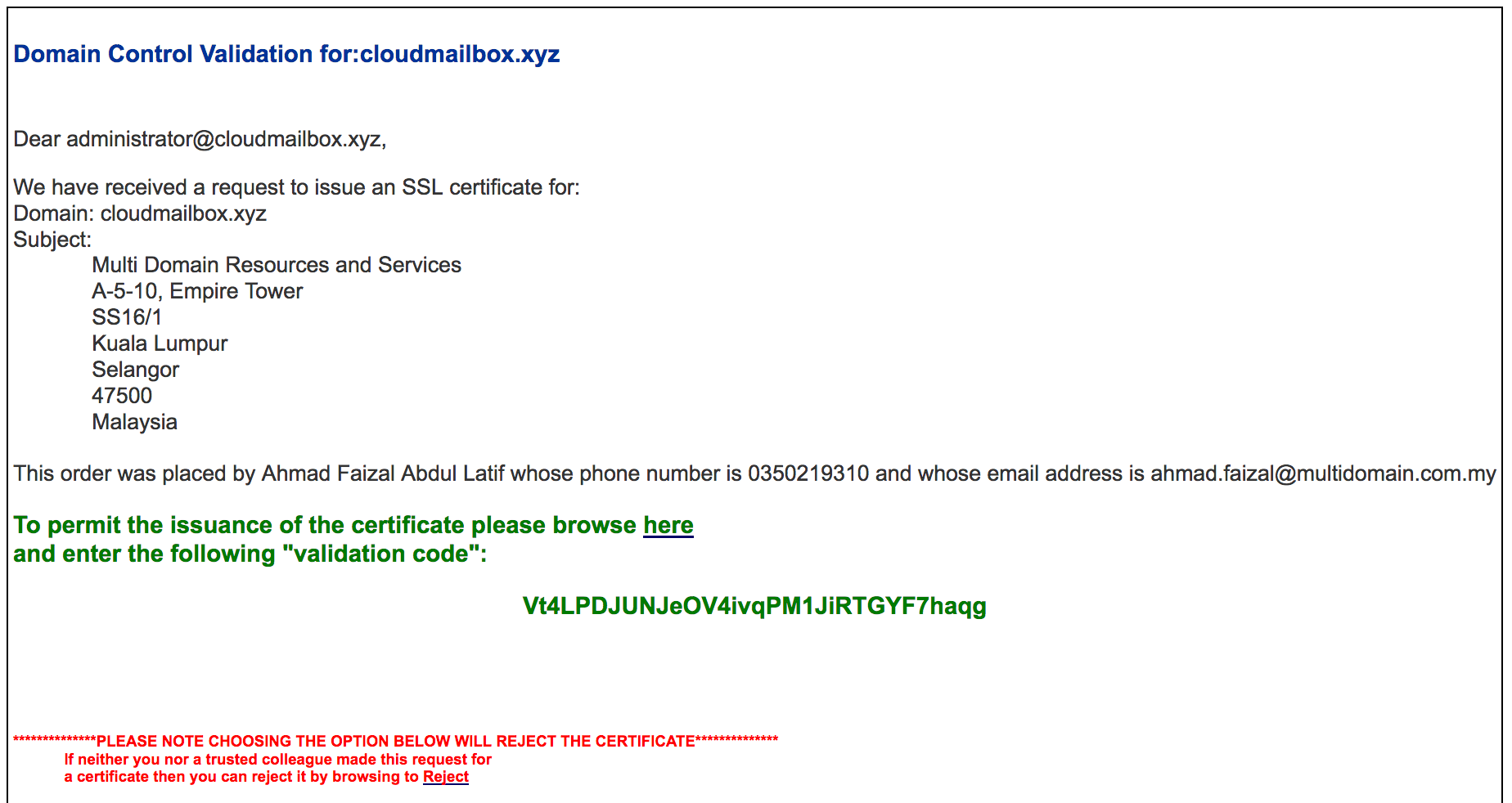 As for this KB, we are using comodo as the Certificate Authority. You will have option to use HTTP/S file based authentication, DNS which is using cname and also email service. We have choose to use email where the validation hash/password will be send to administrator@cloudmailbox.xyz. Now click continue, You will now see that your submission is complete.
