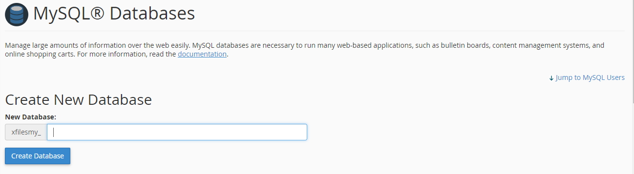 Step 2 : Enter a name for your database and click Create Database. Most of the time, you will want to name your database with your website name, using lowercase letters.