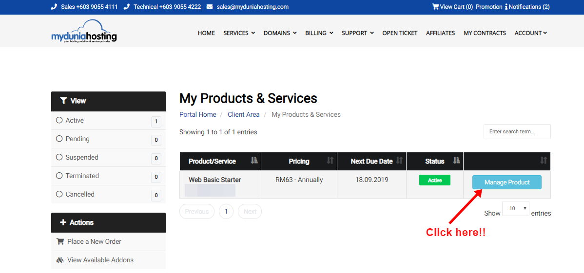 4. After click at tab My Service, will display page My Products & Services. At this page, click at Manage Product as shown below.